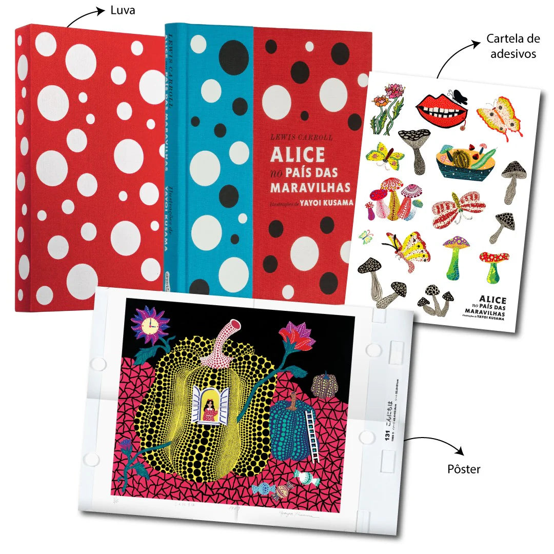 Esta edição apresenta capa dura revestida em tecido, impressão colorida e acabamento primoroso, fruto de uma colaboração oficial com o Kusama Studio (Tóquio) e a Galeria Gagosian. Acompanha ainda case também revestida em tecido e um pôster exclusivo de uma das ilustrações de Alice — um verdadeiro objeto de arte para ser admirado e colecionado.